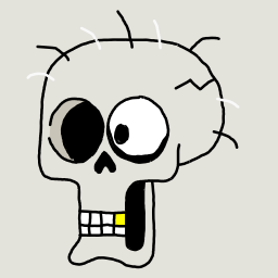 A funny cartoon skeleton skull with mismatched eyes and a single gold tooth.